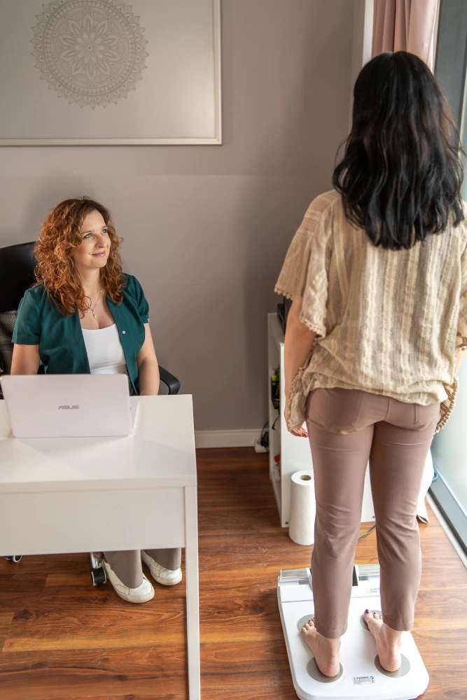 - wykonujemy pomiar zawartości tkanki tłuszczowej, mięśni oraz poziomu nawodnienia,